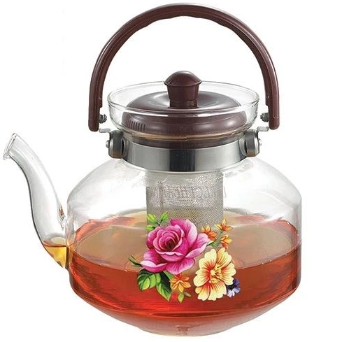 Изготовлен он из боросиликатного стекла. Чайник декорирован красивым цветочным узором.