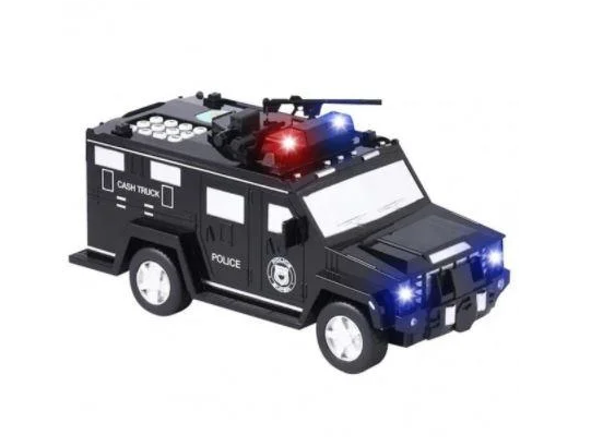 Полицейский инкассатор: принимает бумажные купюры и монеты; хранит деньги в сейфе с кодовым замком. Грузовик копилка с мигалкой и орудиями на фасаде, сделан из прочного пластика.