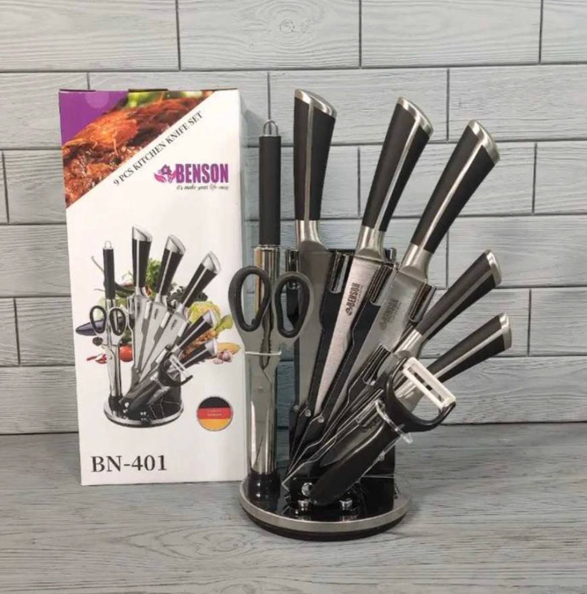 Набор ножей с крутящейся подставкой Benson – полезный предмет для вашей кухни. Он включает в себя все необходимые виды ножей, ножницы, овощечистку и мусат.