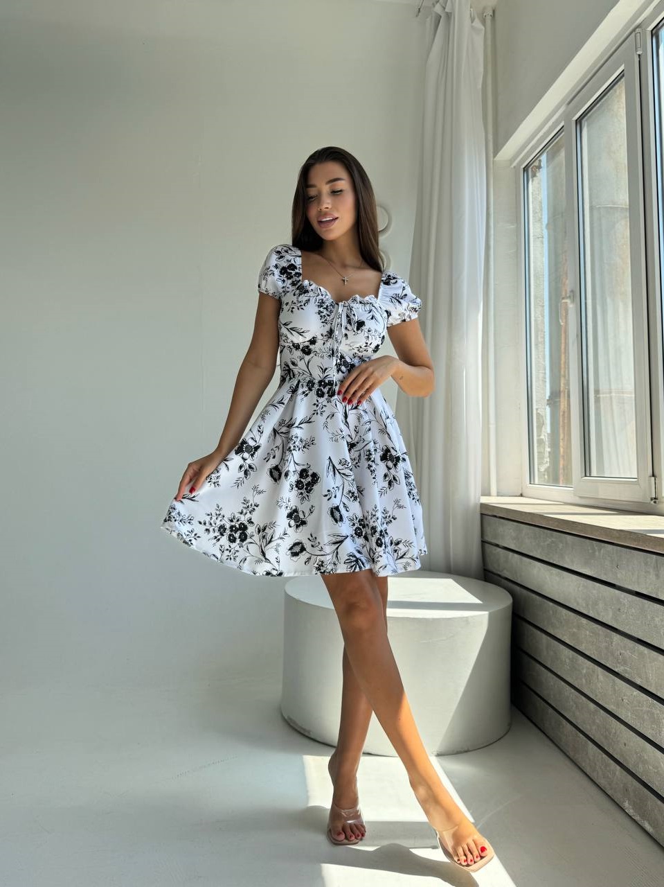 Головна » Магазин » ОДЕЖДА » ПЛАТЬЯ ТУНИКИ САРАФАНЫ » Нежное платье с расклешенной юбкой+красивой зоной декольте белый с черными цветами