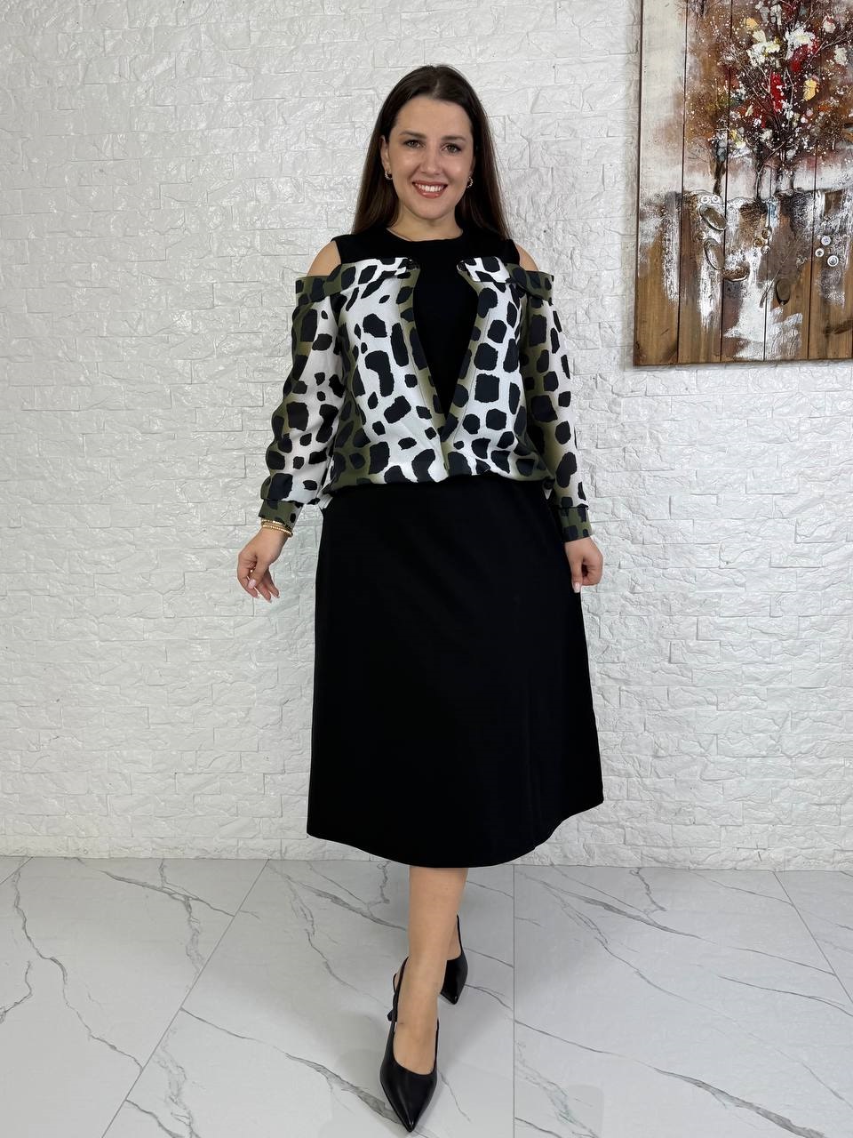 Платье оригинального кроя поверх пришита рубашка в леопардовий принт черный+хаки