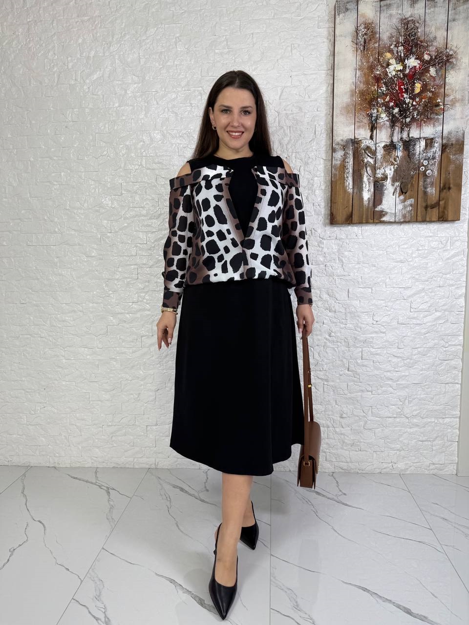 Платье оригинального кроя поверх пришита рубашка в леопардовий принт черный+шоколад