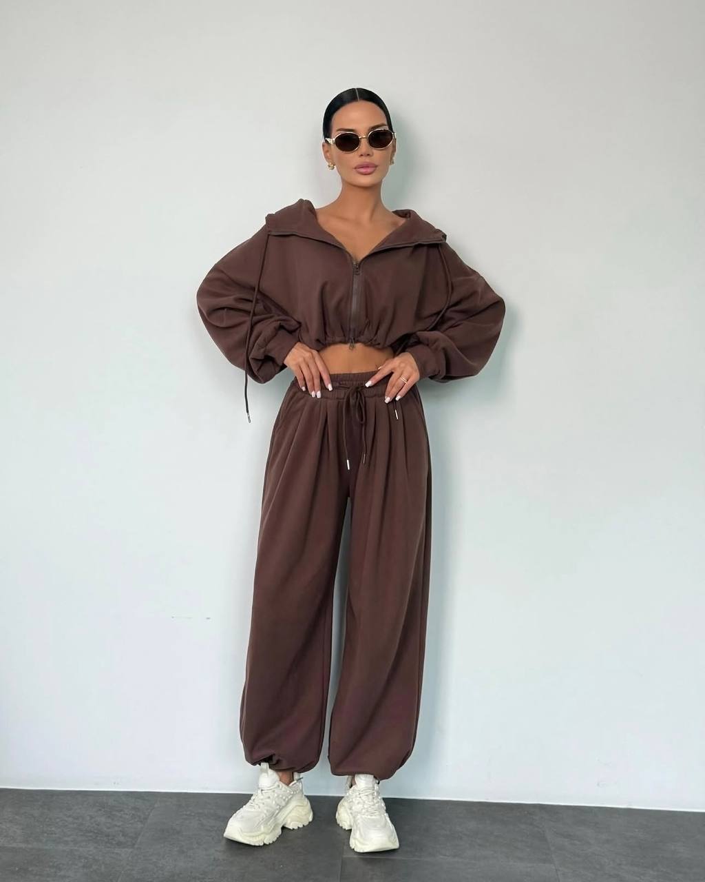 Будьте первым, кто оставил отзыв на “Прогулочный практичный костюм оверсайз: кофта на змейке и объемные штаны шоколад”