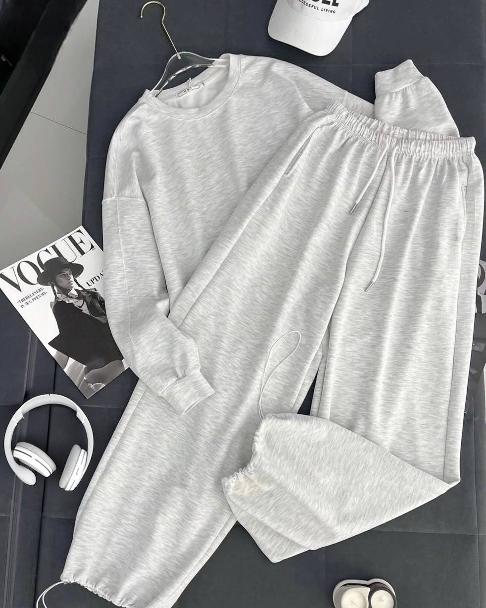 Прогулочный спортивный костюм в стиле оверсайз с объемной кофтой и брюками светло-серый меланж