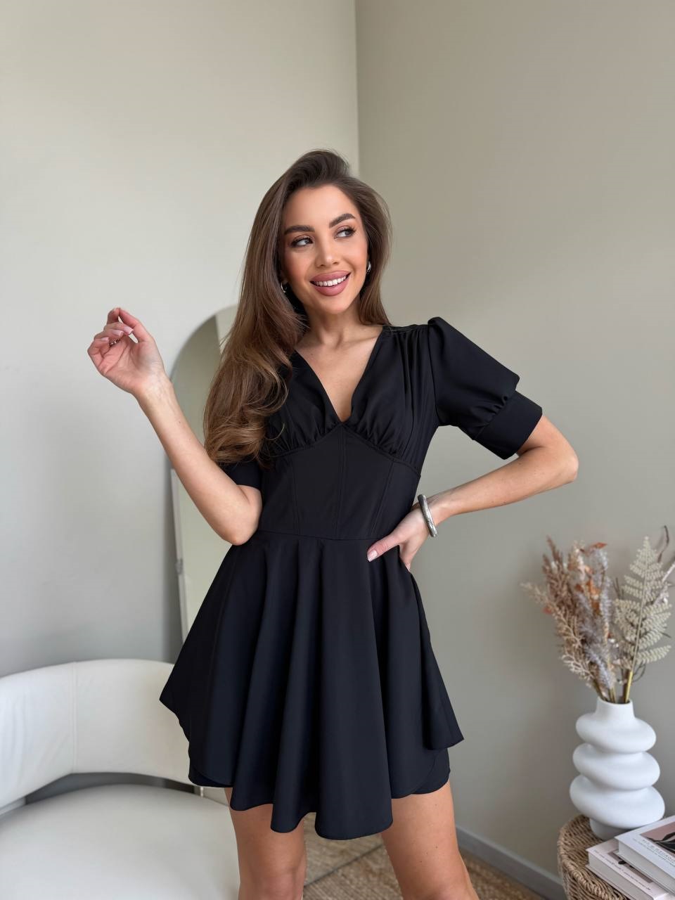 Шелковистое Платье комбинезон с акцетнтым лифом+расклешенной юбкочкой черный