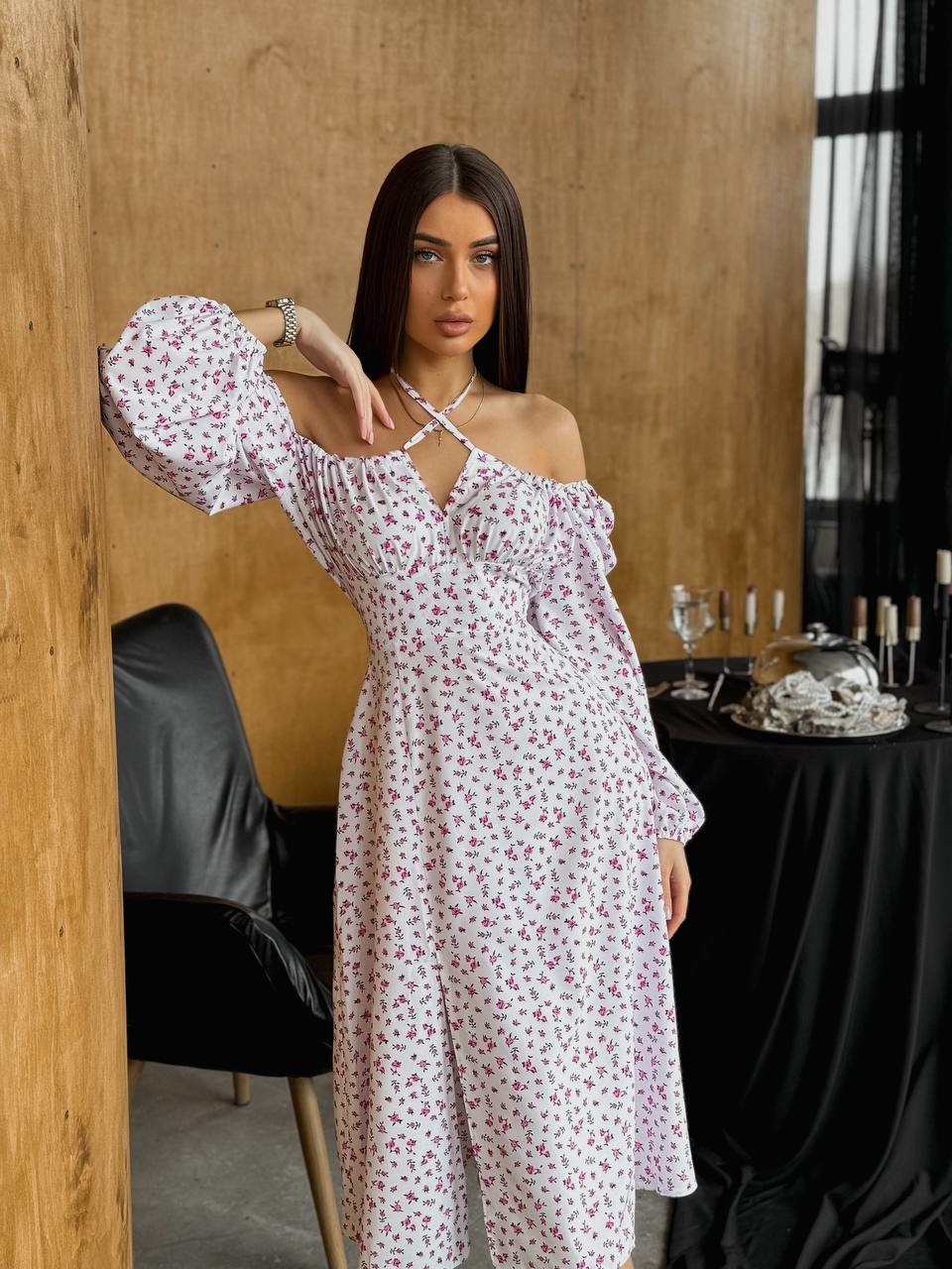 Шелковистое платье с открытыми плечами полуприталеного силуэта белый с розовыми цветами