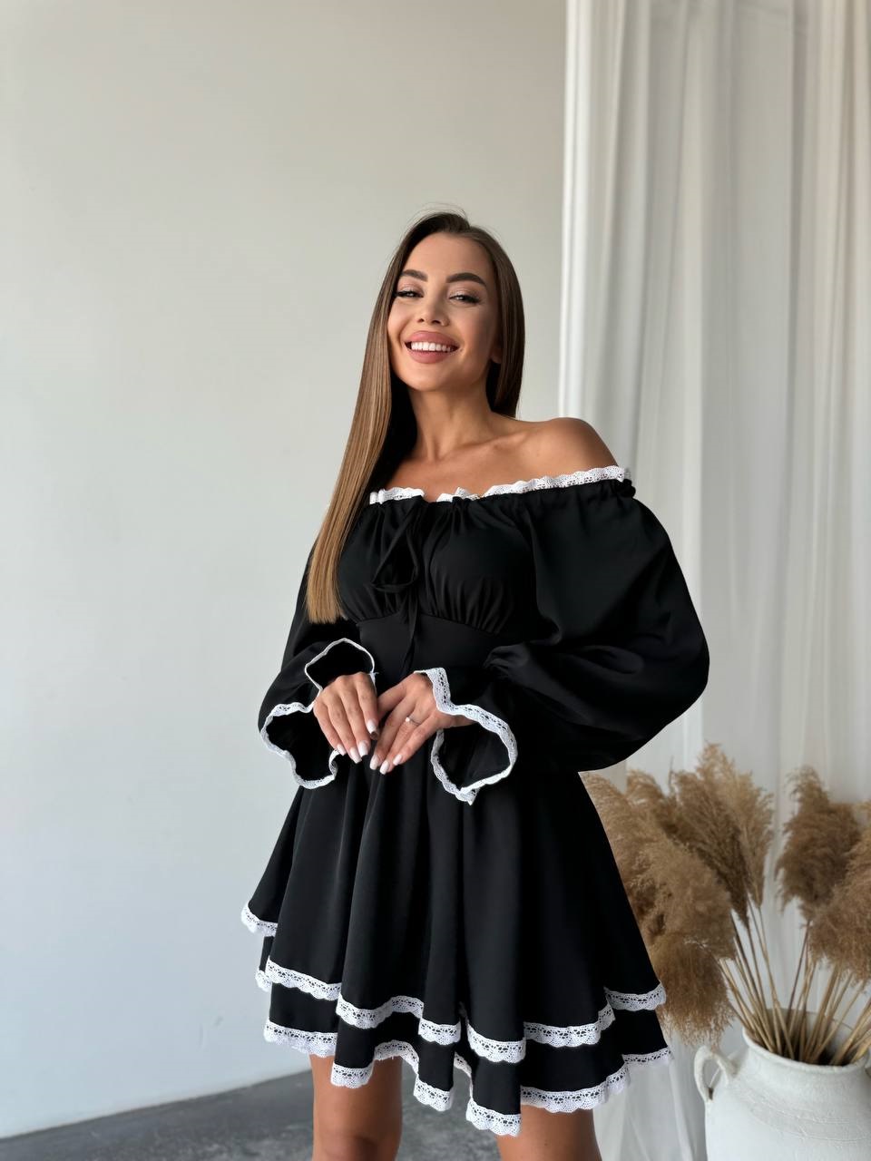 Женственное роскошное платье с кружевом+двойной юбкой+по горловине проложена кулиска черный