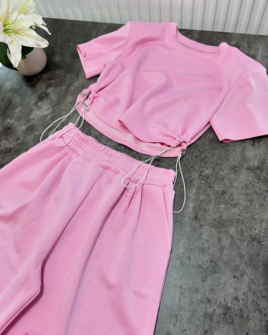 Комплект: футболка с декоративной шнуровкой по бокам + брюки клеш с высокой посадкой.