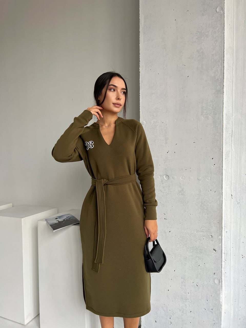 Платье прямое два кармана+ разрезы с обеих сторон пояс трехнить на флисе хаки
