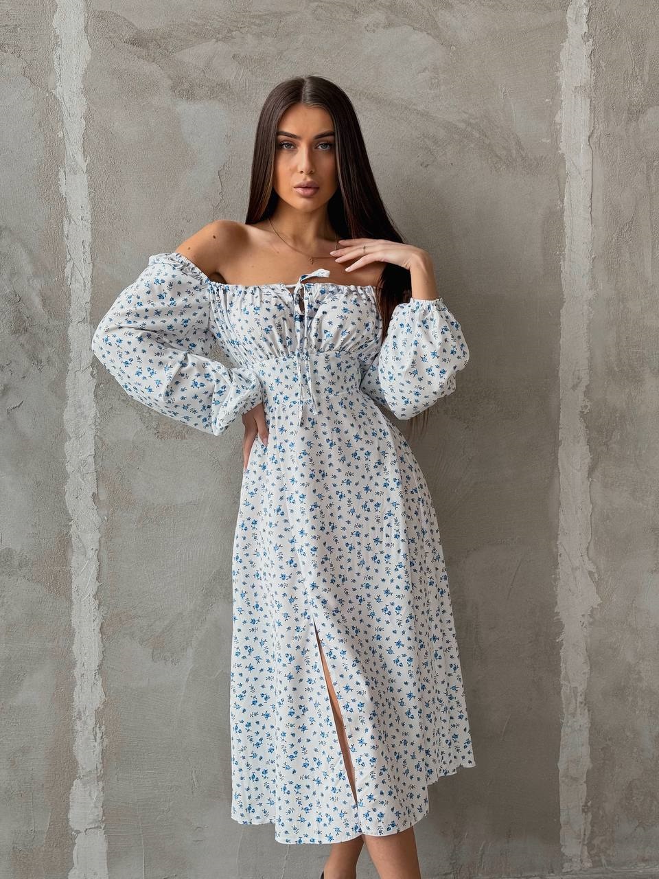 Шелковистое платье с открытыми плечами полуприталеного силуэта белый с голубыми цветами