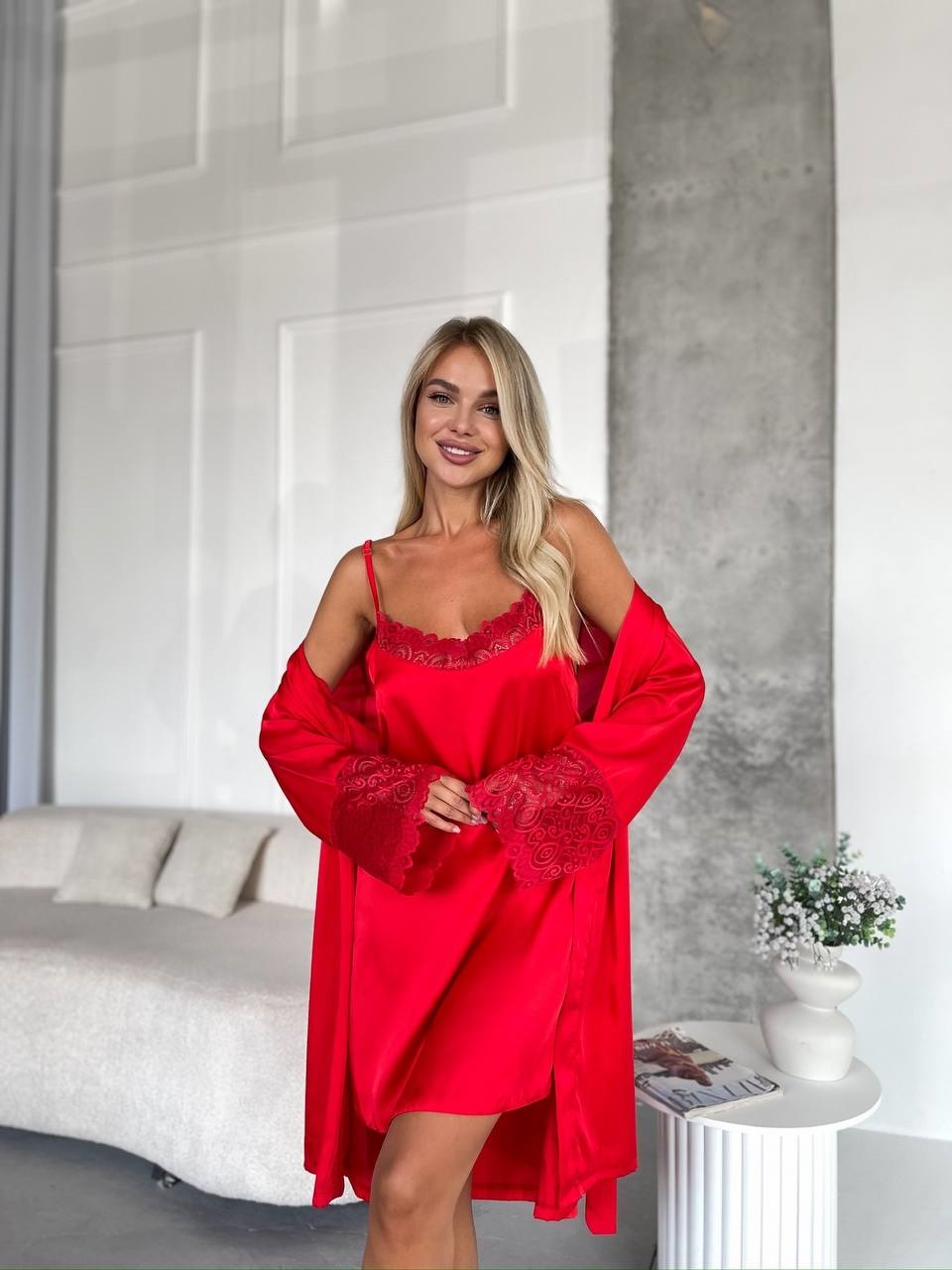 Головна » Магазин » Одяг » Піжама та домашні костюми » Шелковый костюм (халат под пояс+рубашка на бретельках) красный