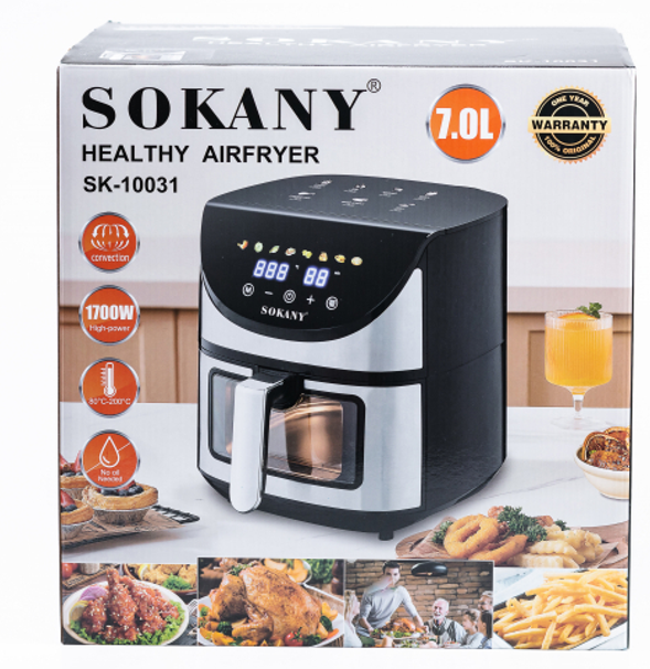 Аэрогриль-фритюрница SOKANY SK-10031 на 7 литров, черного цвета – это многофункциональный кухонный прибор, сочетающий в себе функции фритюрницы и аэрогриля.