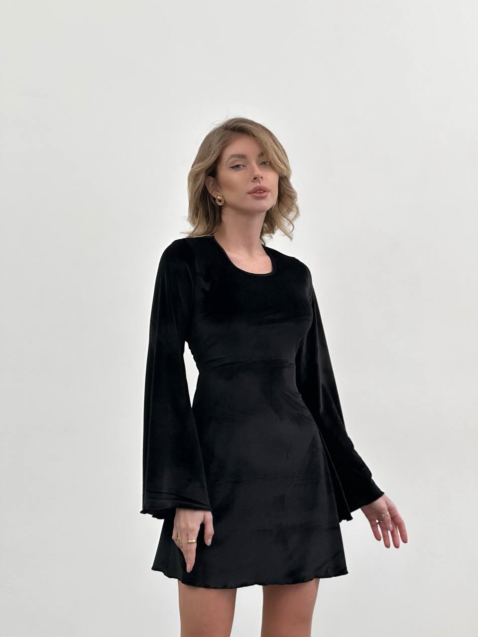 Головна » Магазин » ОДЕЖДА » ПЛАТЬЯ ТУНИКИ САРАФАНЫ » Бархатное мини платье длинные расклешенные рукава талия регулируется шнуровкой черный