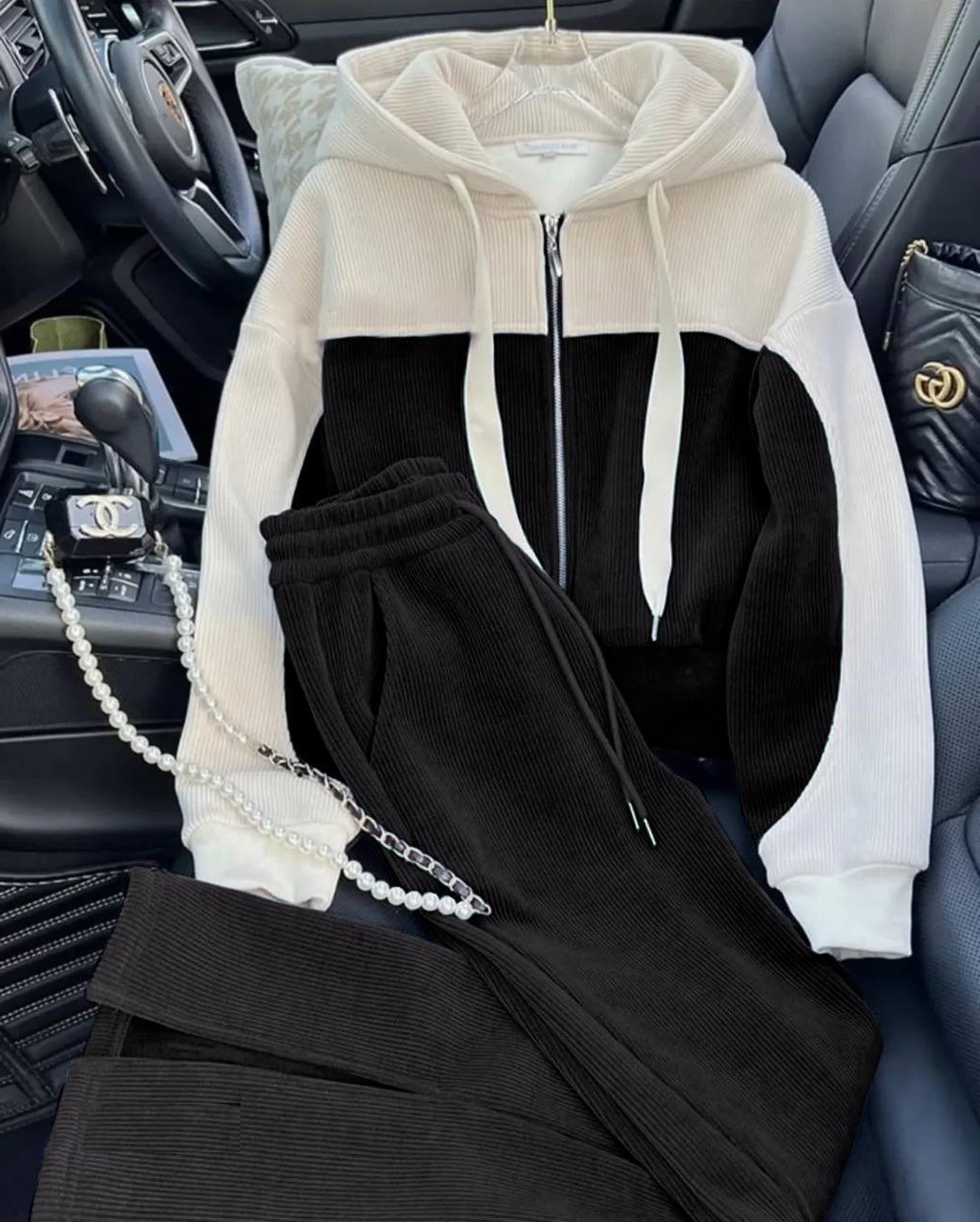 Вельветовый костюм (кофта с капюшоном с контрастными вставками+брюки прямого кроя) молочный+черный