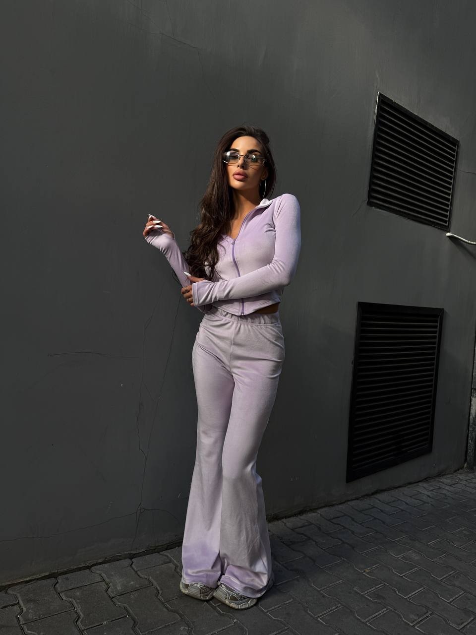 Велюровый костюм: Брюки клеш+Кофта на молнии с отверстиями под пальчики лаванда