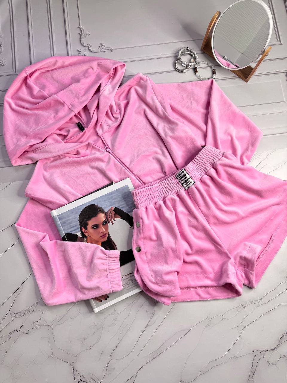 Головна » Магазин » ОДЕЖДА » ЖЕНСКИЕ СПОРТИВНЫЕ КОСТЮМЫ » Велюровый костюм (кофта на молнии с капюшоном+шорты с кнопками по бокам) барби