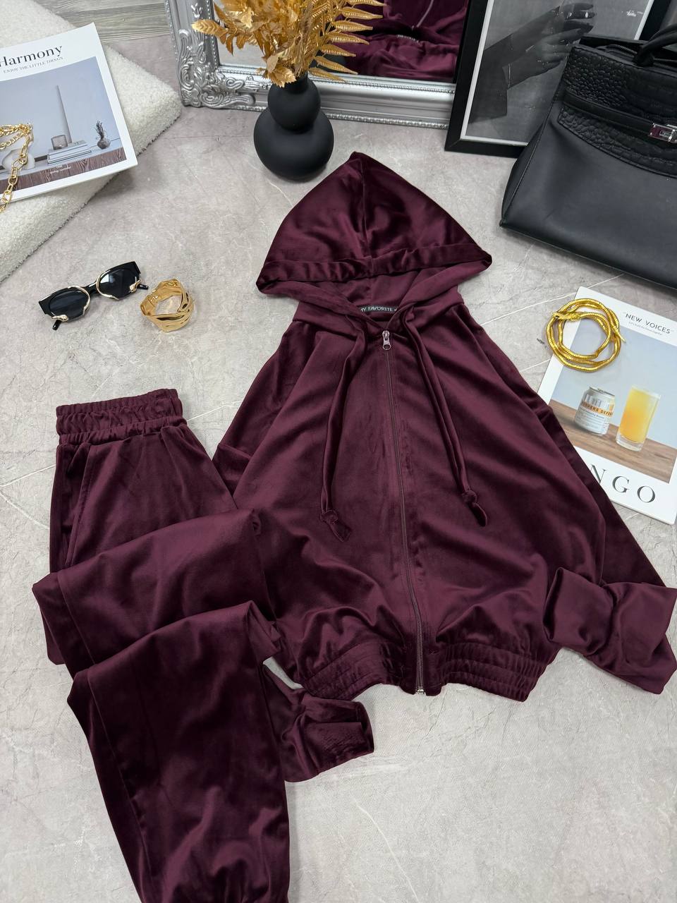 Велюровый костюм: кофта с эффектным двойным капюшоном+штаны марсала