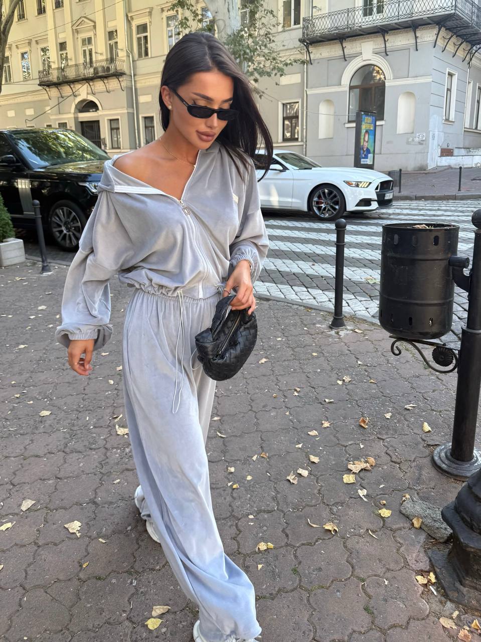 Велюровый оверсайз костюм из лого (кофта снизу на фиксаторах+палаццо) светло-серый