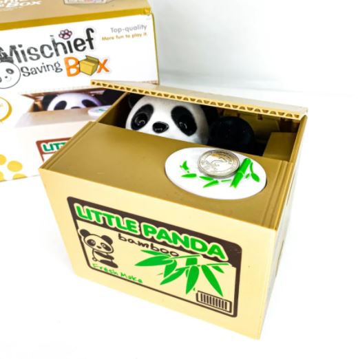 Копилка выполнена в виде котика, свинки, панды сидящих в картонной коробке. Сверху лежит мисочка, как только Вы кладете на тарелку монетку, из коробки раздаётся звук животного и появляется хитрая мордочка, и лапка, которая забирает монетку. Внизу есть отверстие которое закрывается крышкой, благодаря которому монетки можно доставать.