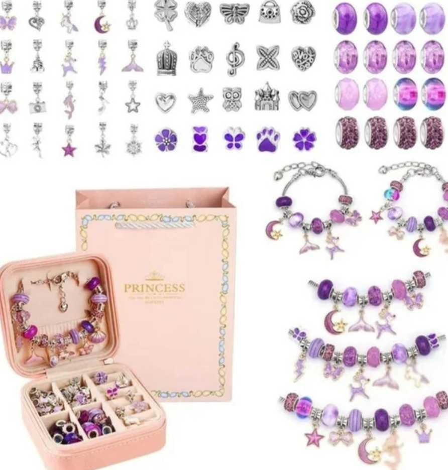 ДЕТСКИЙ НАБОР ДЛЯ ТВОРЧЕСТВА ДЛЯ ДЕВОЧКИ БРАСЛЕТЫ, БАЖКИ ПОДВЕСКИ В СТИЛЕ ПАНДОРА ФИОЛЕТОВЫЙ