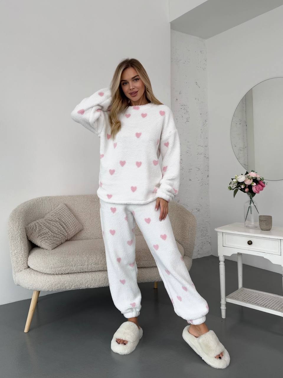 Домашний костюм мех Тедди сердечки (кофта+штаны) белый с розовым
