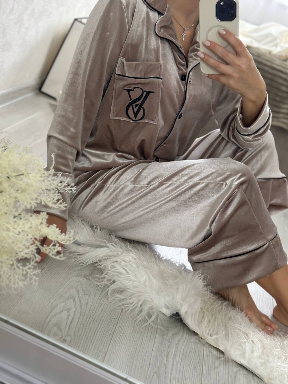 Женская бархатная пижама (рубашка на пуговицах + брюки с комфортной резинкой) жемчужно-бежевый