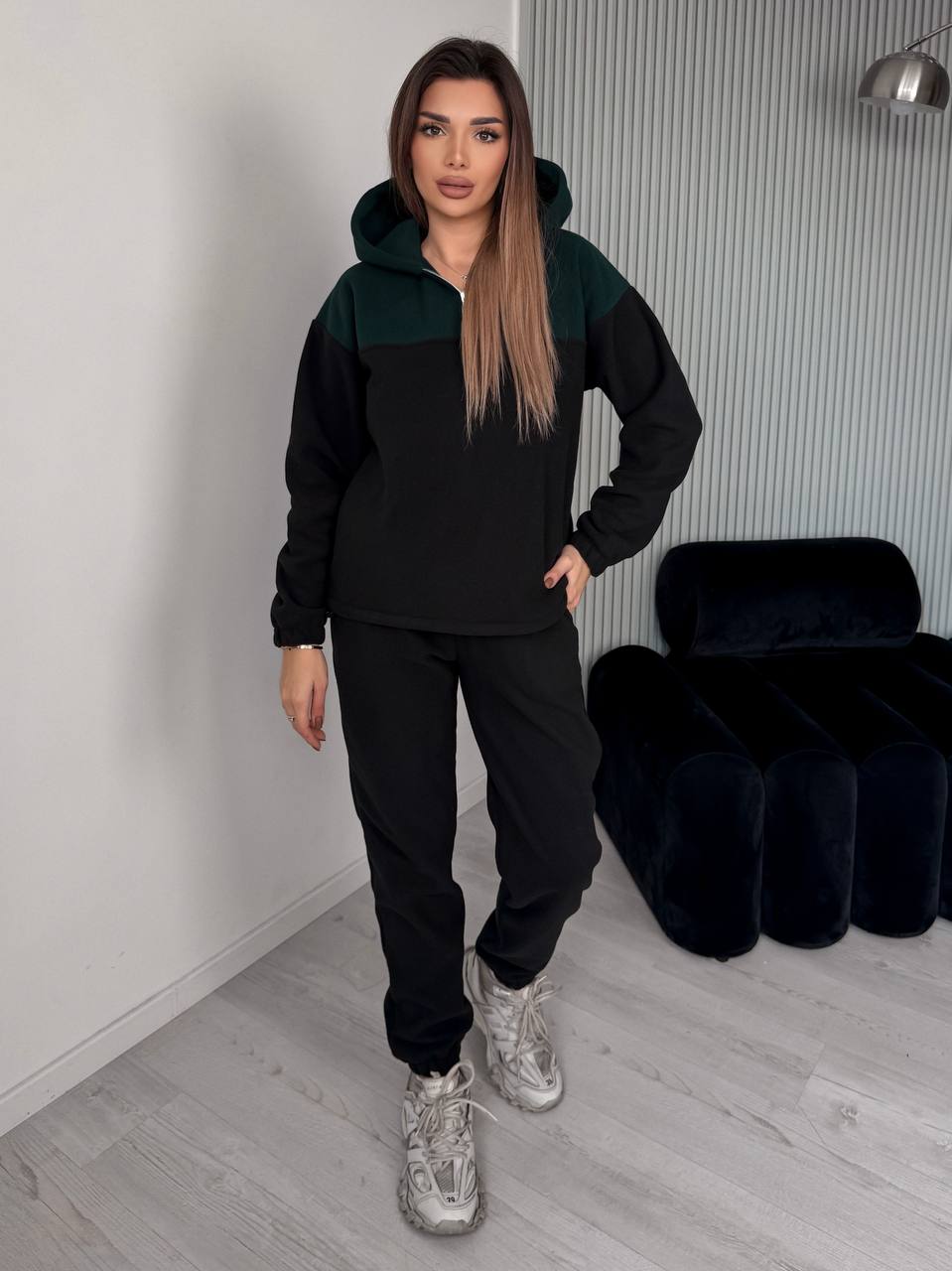Женский костюм Кофта на молнии с капюшоном+брюки с карманами черный+изумруд