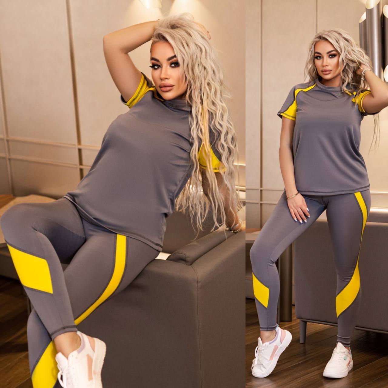 Головна » Магазин » ОДЕЖДА » ЖЕНСКИЕ СПОРТИВНЫЕ КОСТЮМЫ » Женский фитнес костюм серый+желтый