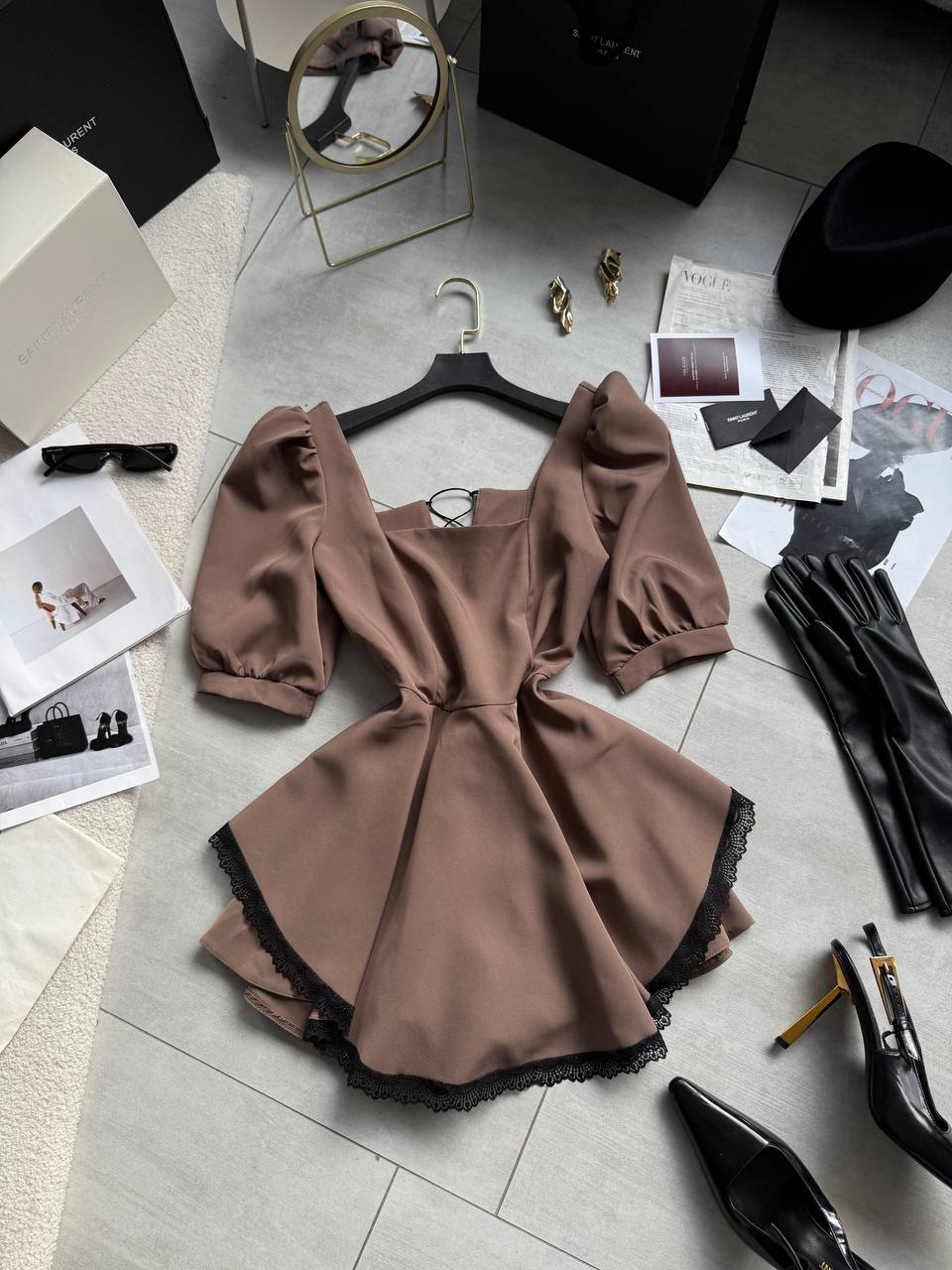Женственный комбинезон с корсетной шнуровкой+ассиметричной юбкой с кружевом мокко