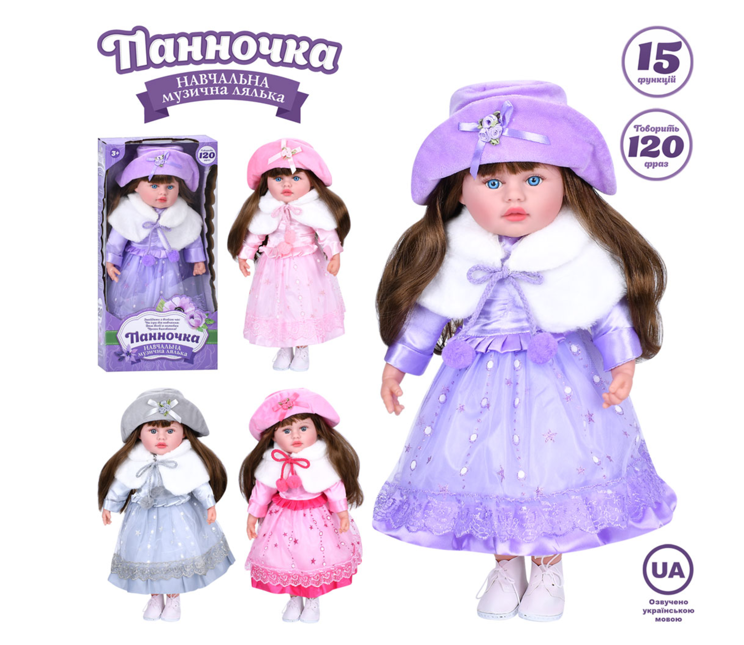 Кукла «Панночка» в красивом, нарядном платье и шляпке. Говорит 100 фраз на украинском языке («Вітаю тебе моя любонько»; «Я маленька україночка!»; «Признаюся, я — модниця!»; «Я знаю багато віршиків та загадок»; «Я залюбки допомагаю матусі прибирати»; «Будь розумницею та без мене не бешкетуй»…) У куклы ручки и ножки выполнены из пластика, а туловище — плюшевое.