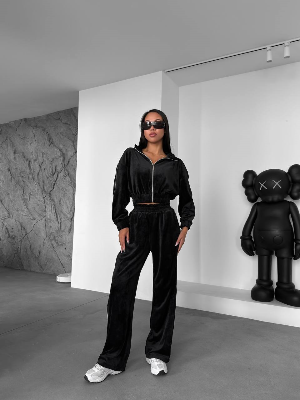 Головна » Магазин » ОДЕЖДА » ЖЕНСКИЕ СПОРТИВНЫЕ КОСТЮМЫ » Классный велюровый костюм (укороченная кофта на молнии+свободного кроя брюки) черный
