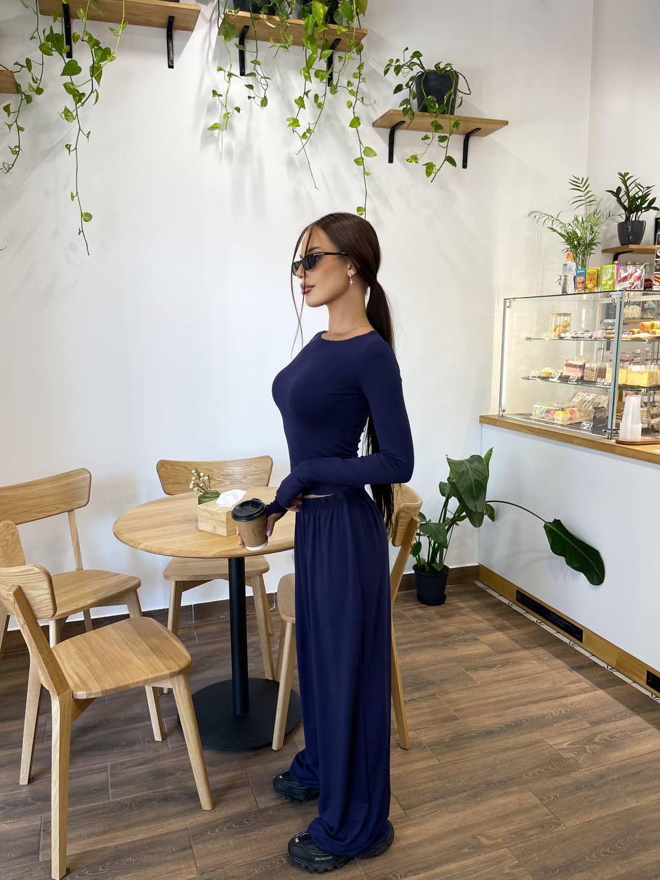 Костюм оверсайз из мягкой натуральной ткани: Лонгслив с вырезами для пальчиков + длинные широкие штаны палаццо.