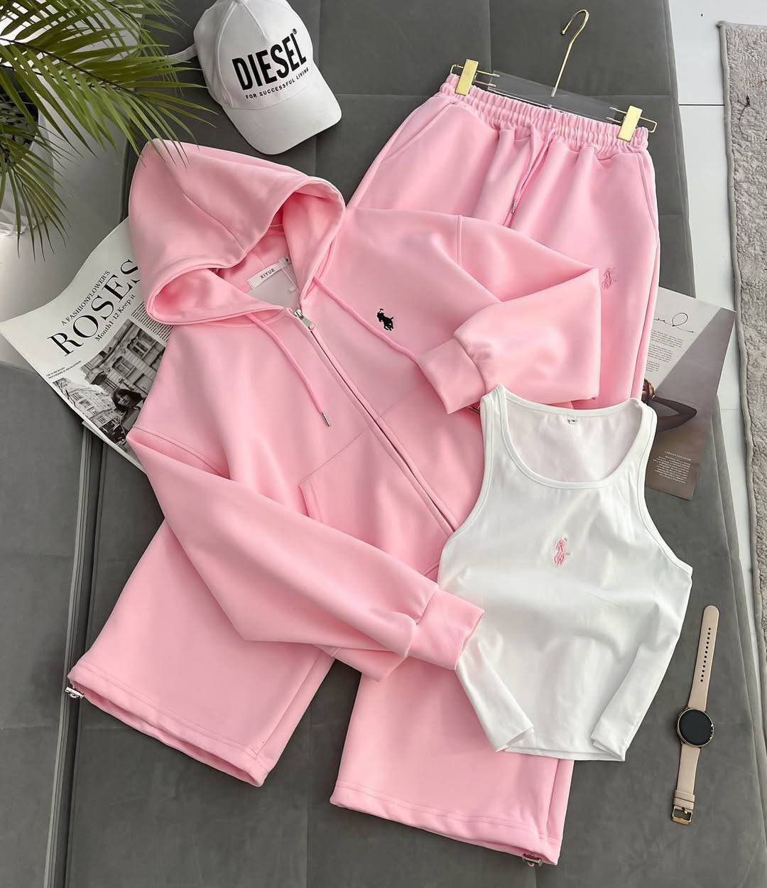 Головна » Магазин » ОДЕЖДА » ЖЕНСКИЕ СПОРТИВНЫЕ КОСТЮМЫ » Комплект худи на молнии с капюшоном+штаны с эластичным поясом+базовая майка розовый