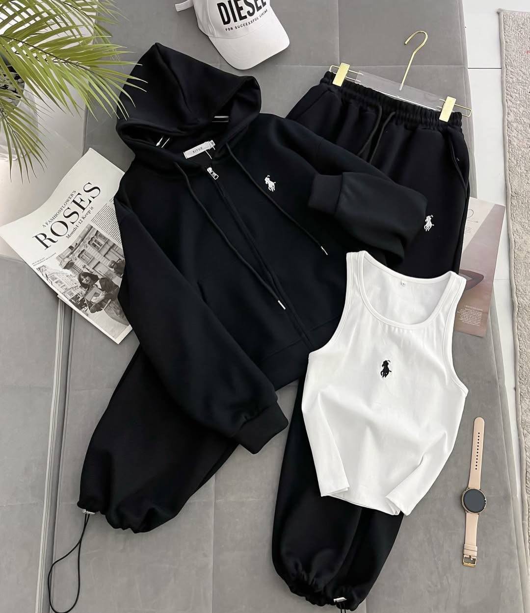 Головна » Магазин » ОДЕЖДА » ЖЕНСКИЕ СПОРТИВНЫЕ КОСТЮМЫ » Комплект худи на молнии с капюшоном+штаны с эластичным поясом+базовая майка черный