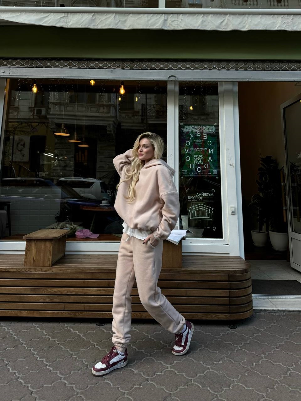 Комфортый костюм из флиса (кофта с капюшоном+брюки с карманами+манжетами по низу) бежевый