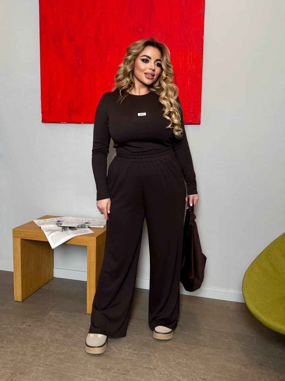 Костюм двойка: кофта-лонг и прямые штаны (джерси с начесом) шоколад