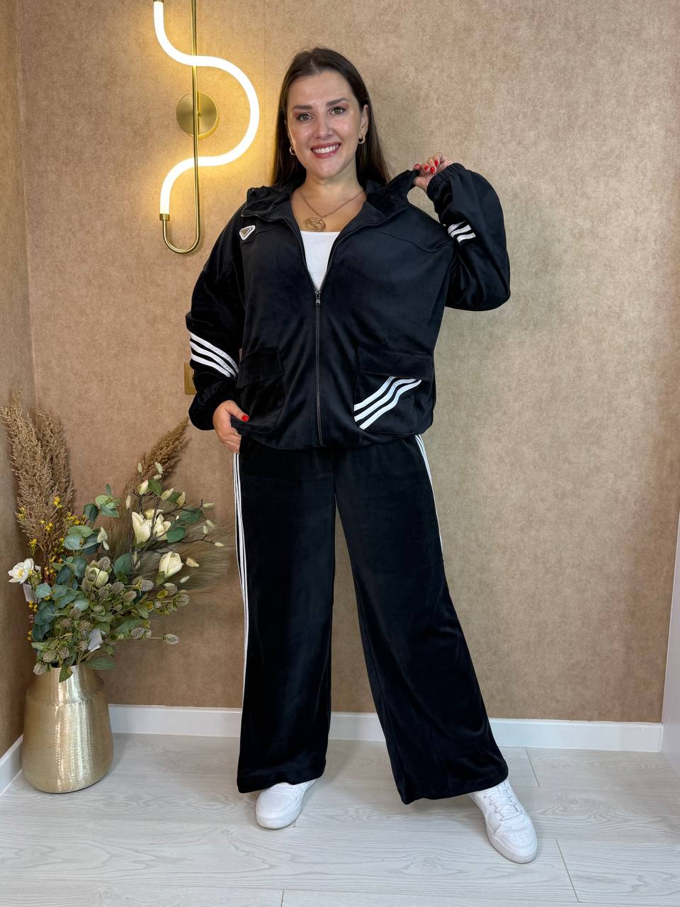 ▫️Очень теплый и приятный на ощупь велюровый костюм. Лампасы идеально дополняют костюм и делают его интересным и стильным. Кофта на молнии, спереди два кармана, низ затягивается на шляпную резинку, есть капюшон. Брюки на резинке с карманами по бокам.