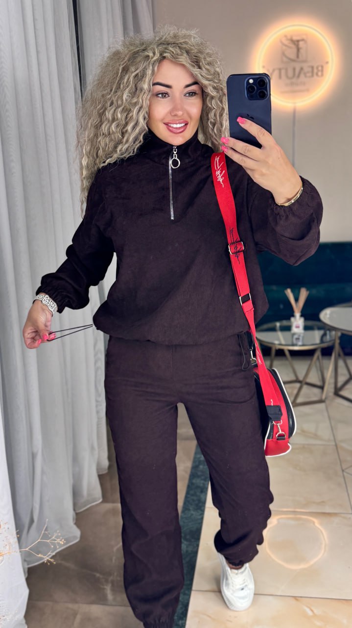 Костюм из микровельвета (кофта по низу резинка+воротник на молнии+брюки с манжетой) шоколад