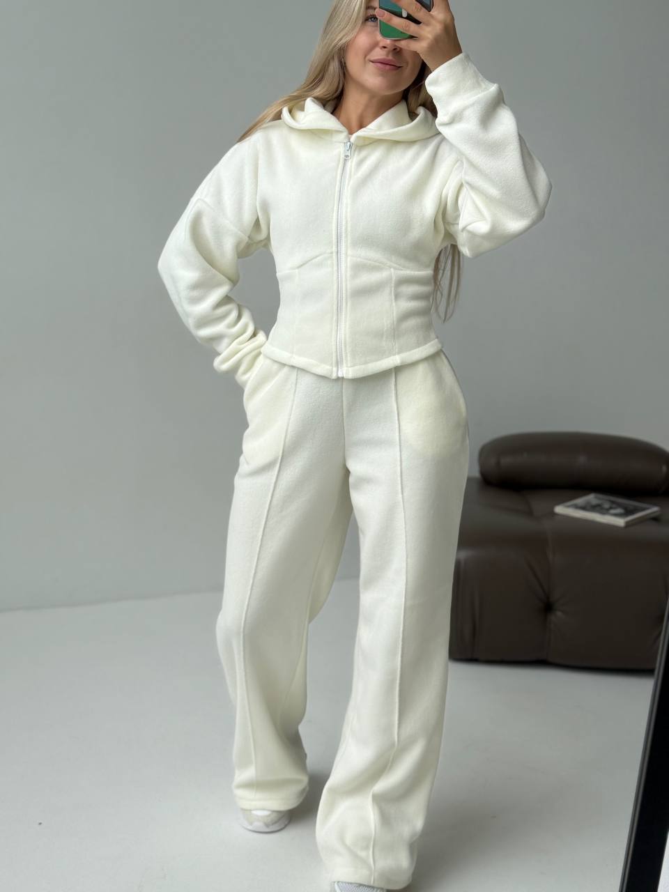 Костюм из мягкого флиса: Кофта на молнии с капюшоном+брюки с высокой талией бежевый