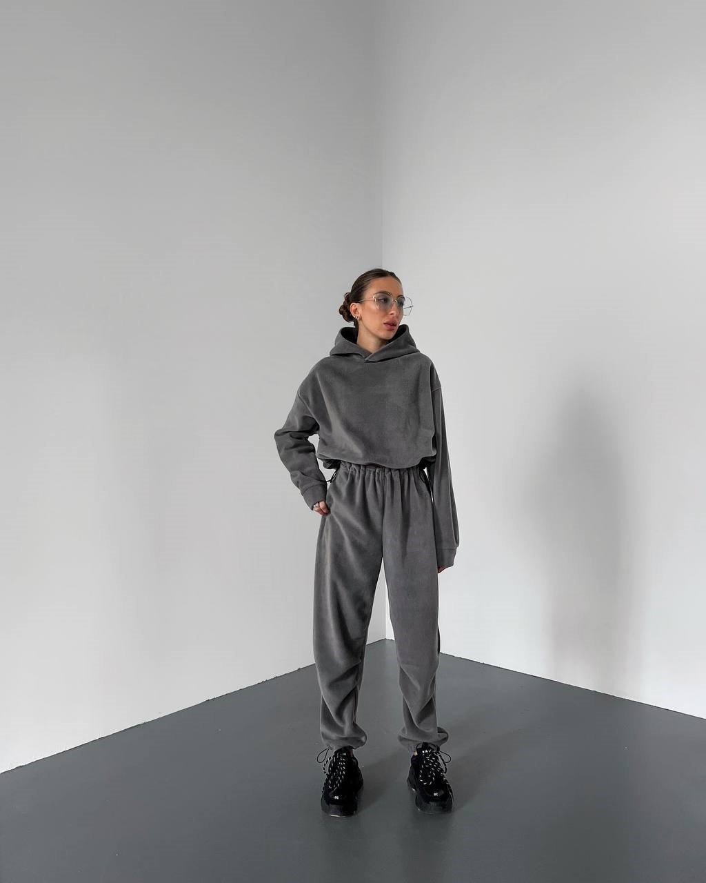 Головна » Магазин » ОДЕЖДА » ЖЕНСКИЕ СПОРТИВНЫЕ КОСТЮМЫ » Костюм из флиса (кофта низ затягивается кулиской+брюки с манжетой на резинке) графит
