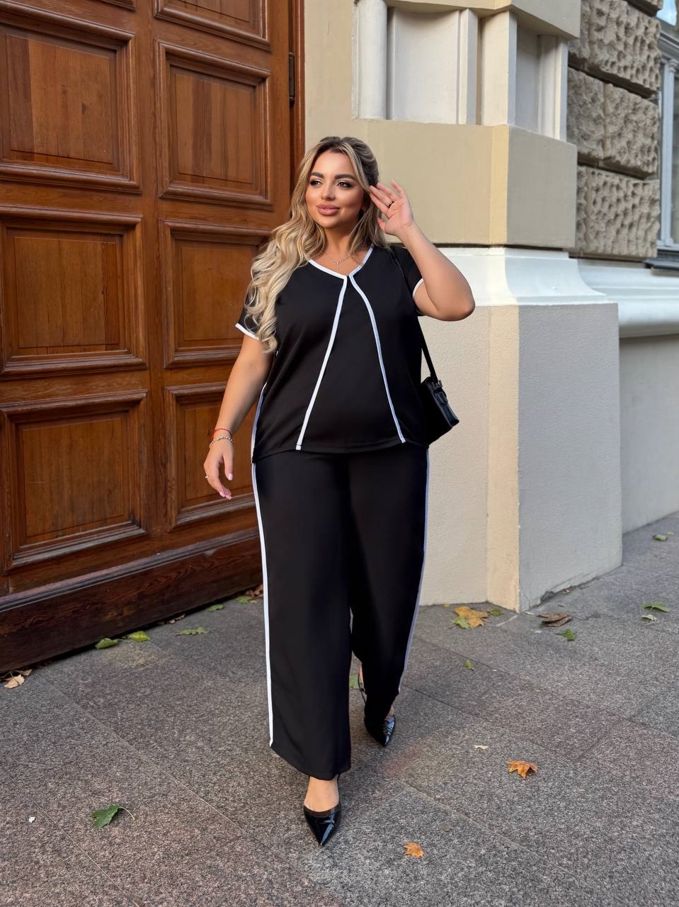 Костюм – двойка классического стиля с белым кантом, который подчеркивает фигуру и скрывает недостатки. Брюки на резинке, по бокам карманы.