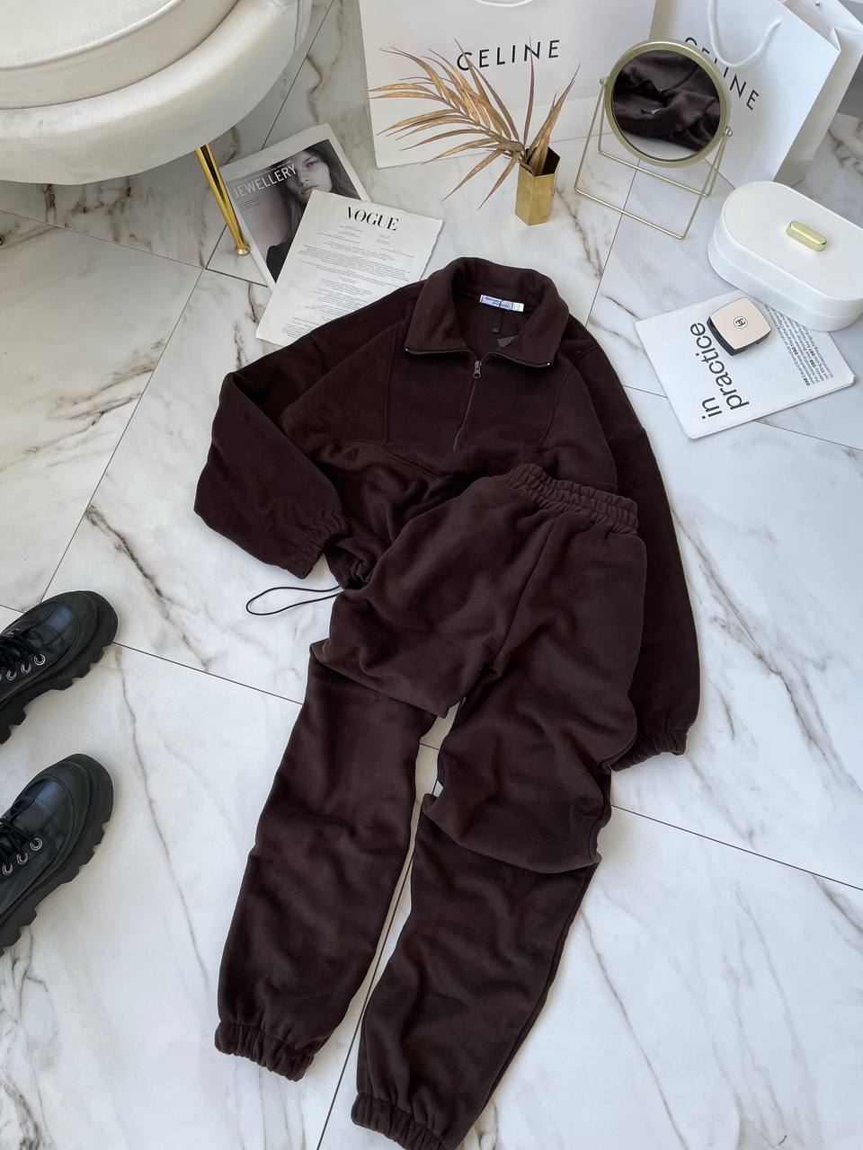 Костюм: кофта на затяжках снизу+джоггеры (двухсторонний флис) шоколад