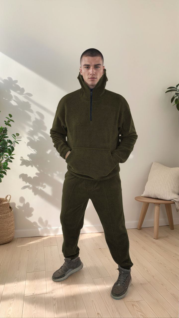 Костюм мужской флисовый (Брюки с шнурком+Кофта с большим карманом «кенгуру») хаки