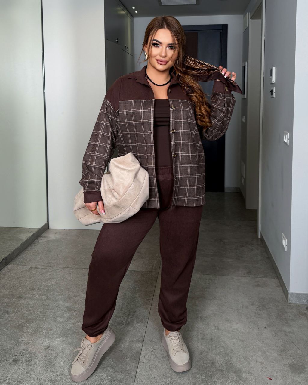 Костюм прогулочный: Рубашка в клетку+джогеры шоколад