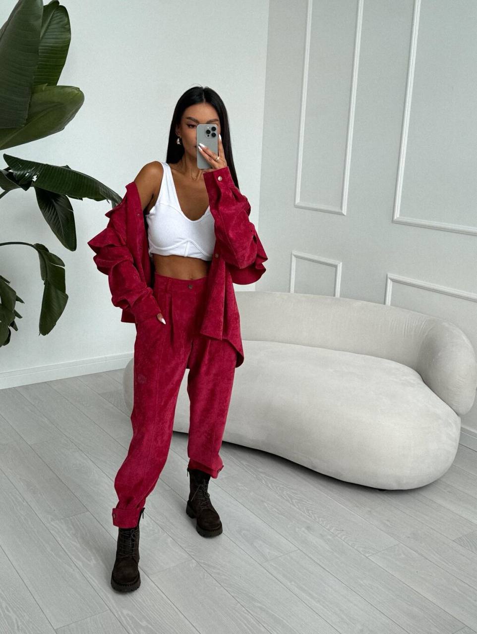 Костюм из мягкой ткани, сочетающий комфорт и элегантность. Состоит из прямых брюк с высокой талией и свободной рубашки оверсайз на кнопках. Идеально подходит для создания как кэжуал-лука с кроссовками, так и более женственного образа с топом и аксессуарами.