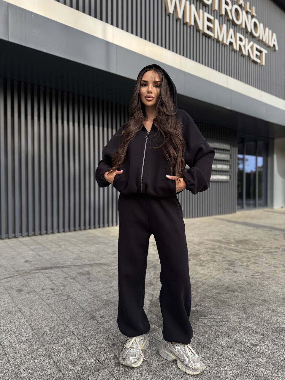 Костюм с объемным худи на молнии и капюшоном, свободные брюки прямого кроя внизу на затяжках, костюм сочетает комфорт и трендовый минималистичный вид, подходит для повседневного образа.