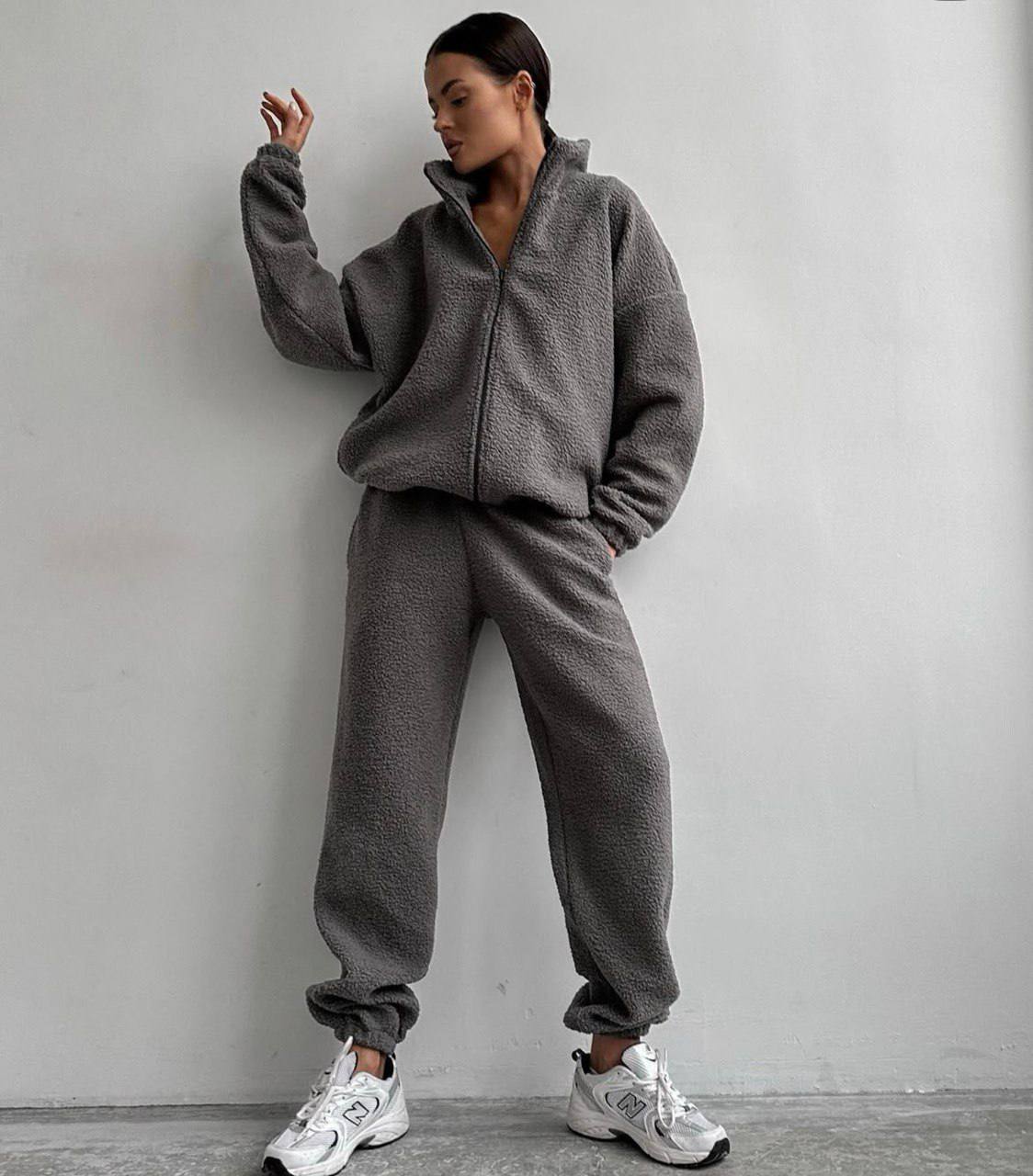 Этот теплый костюм – идеальный выбор для комфортных повседневных образов, прогулок и путешествий. Костюм отлично держит тепло и не утруждает. Имеет пушистую текстуру, придает объем и выглядит очень стильно в любом цвете — шоколадном, черном или графитовом.