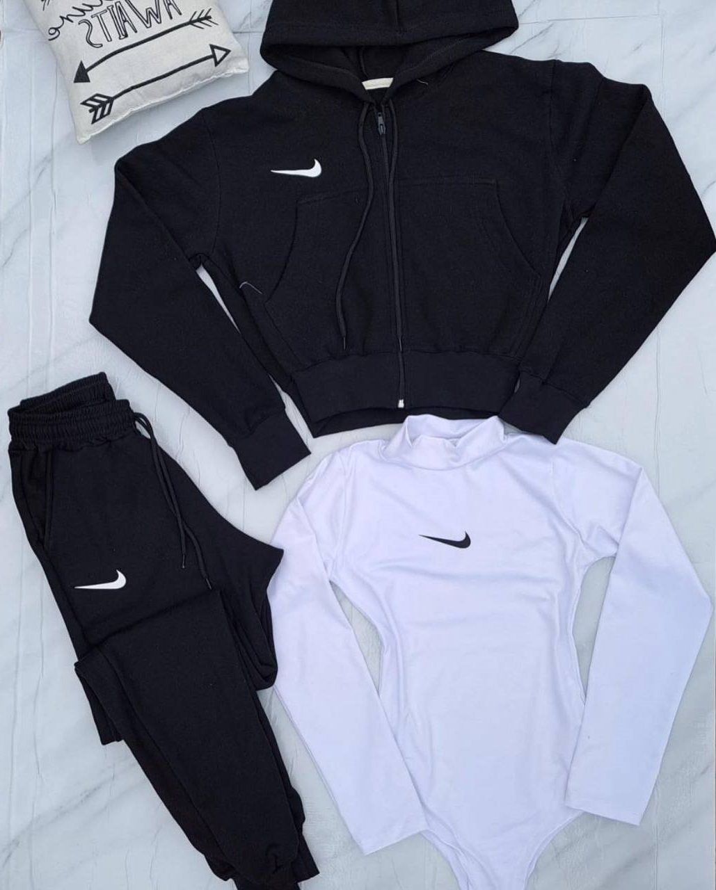 Будьте первым, кто оставил отзыв на “Костюм тройка (двухнитка кофта на молнии с капюшоном+брюки и боди вискоза) черный”
