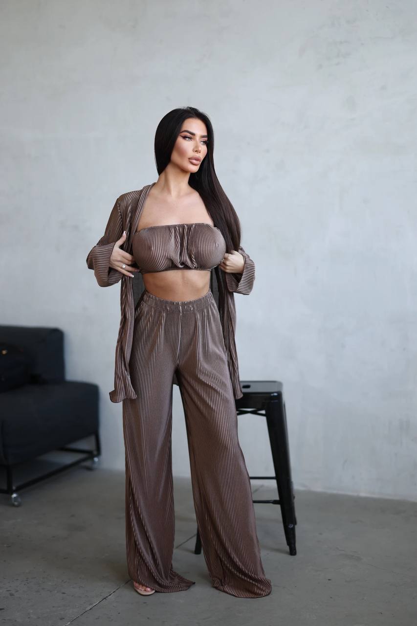 Головна » Магазин » ОДЕЖДА » ЖЕНСКИЕ КОСТЮМЫ » Костюм тройка из ткани плиссе (рубашка+топ+брюки палаццо) шоколад