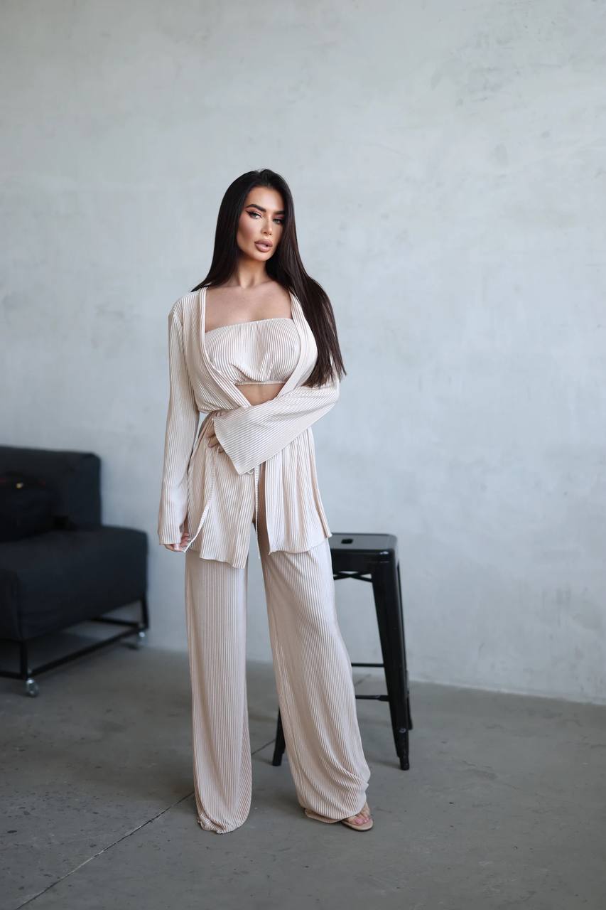 Головна » Магазин » ОДЕЖДА » ЖЕНСКИЕ КОСТЮМЫ » Костюм тройка из ткани плиссе (рубашка+топ+брюки палаццо) айвори